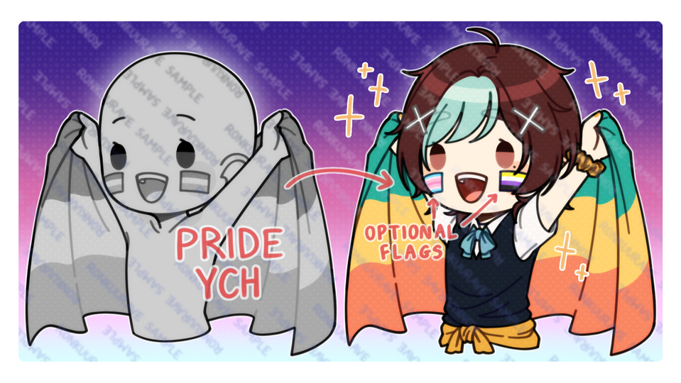 Approximately 1050 x 1050 pixelsA waist-up chibi character showing their pride! Can have up to 3 different flags.If the flag(s) are not well known / MOGAI, you'll have to provide image(s) so I draw the right one(s)! The 2 flags on the cheeks can also be removed if desired!