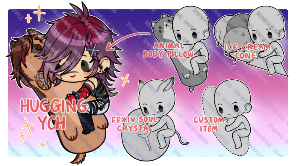 Approximately 900 x 1130 pixelsA full-body chibi character hugging one of various different items! Either an ice cream cone, an animal body pillow, a FFXIV soul crystal, or something else of your choosing*!Optional items are at least $5 while a Custom Item is at least $15!NOTE: Depending on the amount of detail/complexity the custom and optional items are, they may cost more, hence the "at least."