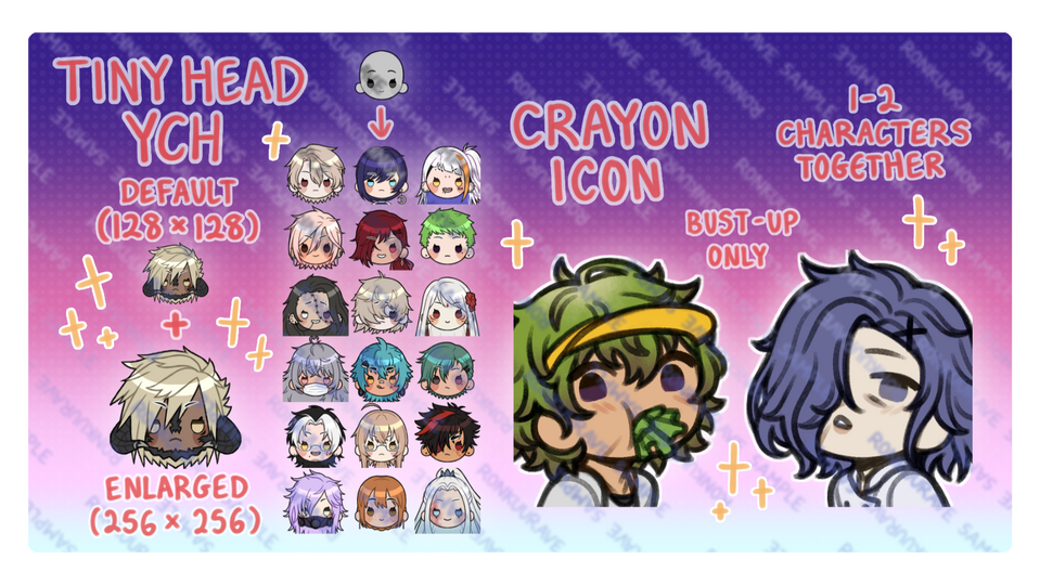 Approximately 500 x 500 pixelsA bust-up chibi with a sketchy crayon look!While this is meant to be used the same way as the Tiny Head, the dimensions for this icon can be adjusted like other types! So this doesn't have to be a square, and can even have an additional character* drawn in together like with Busts, but it will still be bust-up only.NOTE: A Couple Crayon Icon will be the base price + 50% whereas 2 Single Crayon Icons will be doubled base price.